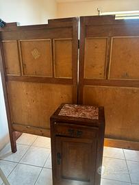 Camera matrimoniale in stile liberty dei primi anni 900, completa di letto senza reti e materasso, 2 comodini con una pietra in marmo rosso, 1 armadio dell'epoca con un, anta danneggiata e un como' con basi in marmo rosso uguale ai comodini ma con lampadina mancante, il tutto è da far restaurare. Solo ritiro a mano.