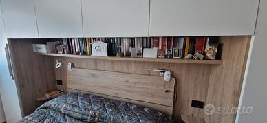 Armadio a ponte e struttura letto matrimoniale. Armadio attrezzato con mensola lunga e mensoline ai lati, attrezzato di scaffali, cassettiera e possibilità di appendere abiti lunghi.