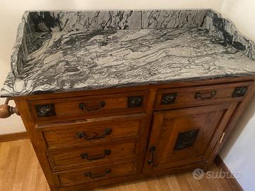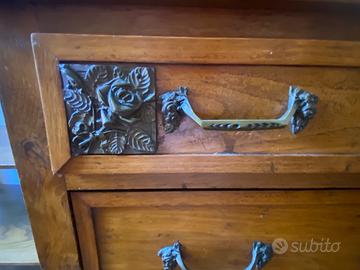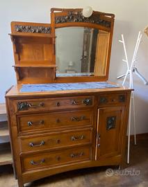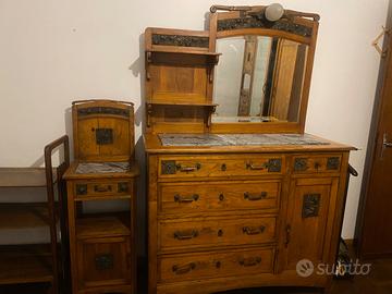 Camera da letto completa, anni ‘20-30 in noce, con decorazioni floreali in ottone brunito e bolle di vetro, composta da: letto matrimoniale, 1 armadio con 3 ante, 2 comodini con piano in marmo grigio, 2 sedie, 1 toeletta con specchio e piano in marmo grigio e 1 comò con specchio e piano in marmo grigio