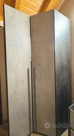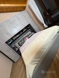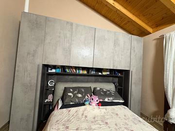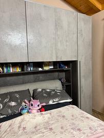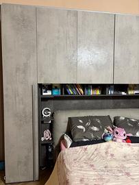 cabina armadio due ante angolare, armadio a ponte sei ante, tre librerie di cui una da 6 spazi e due laterali da 4, base letto matrimoniale in tinta con la camera.