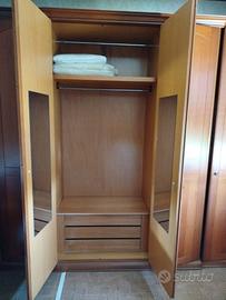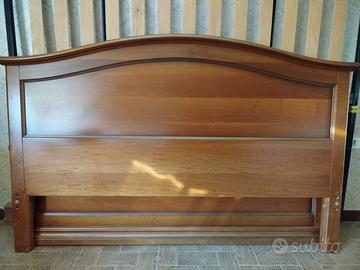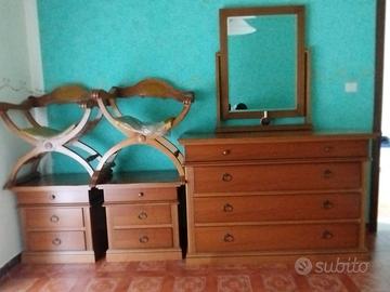 Vendo camera da letto matrimoniale completa, stile classico italiano in legno ciliegio tono miele. Maniglie ad anello in metallo bronzato su tutti i pezzi. Condizioni ottime, ancora lucida e integra. Composta da: Letto matrimoniale con testata arcuata sagomata + rete a doghe Armadio 5 ante smontabile con cornicione superiore e zoccolo 2 comodini 3 cassetti con colonnine laterali scanalate Cassettiera 4 cassetti Specchiera orientabile 2 sedie Savonarola in legno con seduta in tessuto Tutto in perfetto stato, nessun danno o segno d'uso rilevante. Vendo per rinnovo arredamento. Vendita esclusivamente del set completo. Prezzo: 900 € — poco trattabile. Smontaggio e ritiro a carico dell'acquirente. 📍 Arzignano (VI)