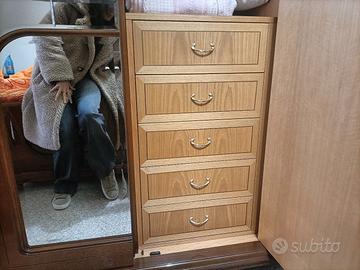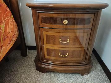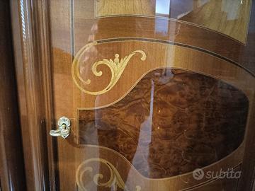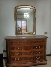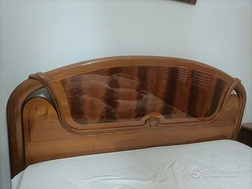 Vendo camera matrimoniale completa, in stile classico elegante, con intagli in legno e decorazioni in radice di noce. Di seguito l'elenco dei componenti e le relative dimensioni: 2 Comodini 64x40x62h Letto 182x210x120h Armadio (a 5 ante di cui 3 a specchio, con cassettiera interna, mensola al centro e bastoni per stampelle sopra e sotto) 285x59x240h Comò 140x55x90h Specchio 79x110h