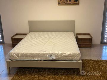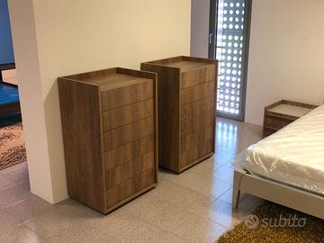 Gruppo letto della COLOMBINI CASA, modello Volo v2 con colori cassa grigio Dorian e frontali rovere cognac composto da letto (escluso rete e materasso), 2 comodini 2 settimanali, cassetti con chiusura ammortizzata.