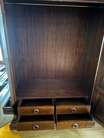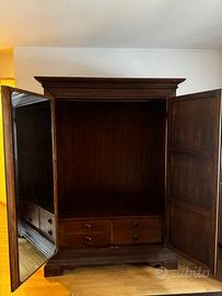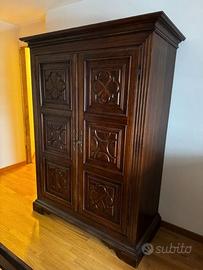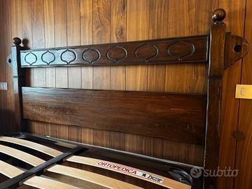 Vendo camera da letto matrimoniale in legno massiccio (probabilmente rovere o noce) con finitura scura e molto calda, ben conservata adatta per chi ama uno stile classico/rustico di montagna ma che si adatta molto bene anche in un ambiente moderno in città. L'armadio ha 4 cassetti è molto capiente e solido, misure 162X65X200 La testiera del letto misura 193X123. I mobili sono venduti smontati, eventualmente anche separati, possibilità di acquistare anche rete ortopedica e materassi, il ritiro è esclusivamente in loco a carico dell'acquirente.