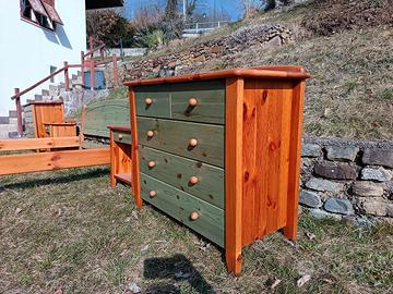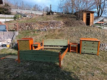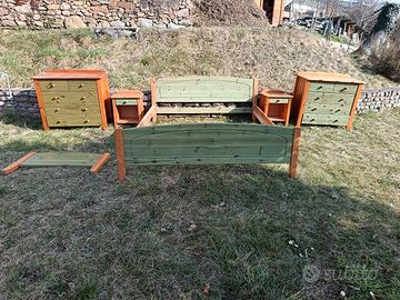 Camera matrimoniale in legno tenuta bene: 1 letto matrimoniale, 2 comodini e 2 cassettiere. In aggiunta anche 2 letti singoli uguali al letto matrimoniale. Sia il matrimoniale che i due singoli sono comprensivi della rete.