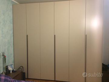 01 ARMADIO battente 06 ante L. 287,5 cm H. 256 P. 60 cm a tre vani- dotazione interna 03 ripiani + 01 cassettiera interna a 03 cassetti. Finitura laminato grigio seta e maniglia lunga laminato rovere;