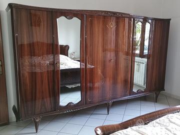Vendo camera matrimoniale anni ’60 composta da armadio 300x183x60 cm - letto 210x186 cm - 2 comodini 55x35 altezza 59 cm - cassettone 185x55 altezza 74 cm più specchio 110x100 cm. Su comodini e cassettone è presente uno splendido piano in marmo integro