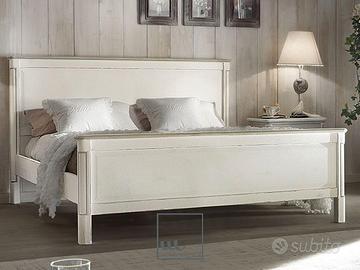 > Il letto è laccato bianco con profili grigio provenzale lungo le colonne; comò e comodini grigio provenzale con profili bianchi.
