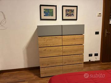 camera matrimoniale completa con letto contenitore 2 comodini a 2 cassetti rallentati 2 settimini e armadio battente a 6 ante da 270x60x253h con cerniere rallentate e cassettiera interna a tre cassetti rallentati e ripiani interni con tubi appendiabiti tutto nuovo