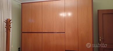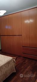 Camera matrimoniale completa di letto, armadio con sei ante e tre cassetti , due comodini con cassettiera e specchio. Color noce chiaro.