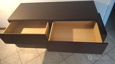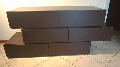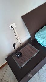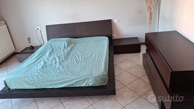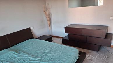 camera matrimoniale composta letto stile futon con spalliera in pelle, comò minimal costituito da 3 moduli separati componili a piacimento. 2 comodini affiancabili alla cornice del letto per un effetto monostruttura. legno color wengè. materiale ottimo..Vaso in omaggio. ritiro a Fagnano Olona