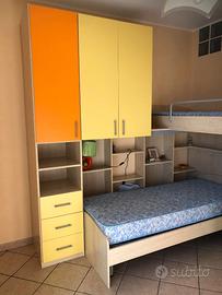 Vendo due letti con armadi, comprensivi di un comodino, due materassi e una scala. E’ tutto moderno e colorato (arancione, giallo e grigio chiaro). E’ stata utilizzata ma è in ottimo stato di conservazione. La parte più alta arriva a 245 centimetri, inoltre, il mobile, ha una lunghezza di 240 centimetri e una larghezza di 195 centimetri.