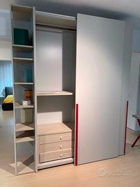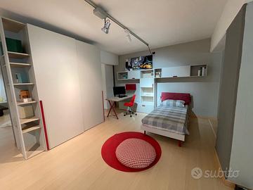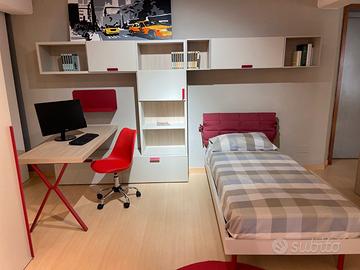 Camera completa come da foto con armadio 2 ante scorrevoli e libreria L. 213X H 260, composizione libreria/scrittoio/comodino L. 365X H 165, letto con rete e materasso, colori Canapa, mandorlo e Rosso.