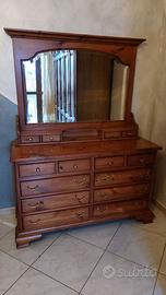 Camera Old America della Patriarca, venduta ESCLUSIVAMENTE in blocco, composta da: * Armadio * Specchiera * Letto, Sedia e materasso * 2 Comodini Tutti i mobili sono in LEGNO MASSELLO finemente lavorati, usati ma in condizioni pressochè perfette. Ideale arredamento caldo e/o per accoglienti ambientazioni, anche per una seconda casa. I mobili non si spediscono ma ritirano in loco e trasportano a Vostra cura (posso aiutare nello smontaggio), Lo stile è quello intramontabile "vecchia america" della Patriarca. Qualità top, tutto legno massello, niente a che vedere con l'impiallacciato. Dimensioni: ARMADIO: Larghezza: 255 CM: Profondità: 63 CM; Altezza: 202 CM. Composto da 5 Ante, con ogni scomparto su 2 ripiani e con appendiabilti inclusi. COMO'-SPECCHIERA: Larghezza: 140 CM: Profondità: 55 CM; Altezza: 85 CM (piano) e 183 CM (specchio). Composto da 6 cassetti doppi; 4 cassetti singoli; 4 cassetti "scrigno" sul top. COMODINI: Larghezza: 60 CM: Profondità: 43 CM; Altezza: 71 CM. Composti da 3 cassetti doppi + 2 cassetti singoli. LETTO: Larghezza: 172 CM: Profondità: 215 CM; Altezza: 43 CM. (piano) MATERASSO: Larghezza: 160 CM: Profondità: 190 CM; Altezza: 30 CM. (ma rete fino a 165 x 200) SEDIA/POLTRONA: Larghezza: 65 CM: Profondità: 50 CM; Altezza: 50 CM. (piano) Contattate Angela per concordare un sopraluogo senza impegno per constatare la qualità dei materiali e delle finiture. I mobili vanno visti, per essere apprezzati !