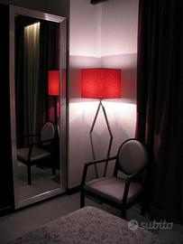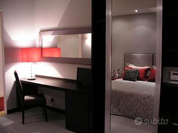Vendo camera per hotel in legno wengè, ma valida anche a casa, completa di scrittoio, armadio con un anta scorrevole a specchio, sommier imbottite e testiere letto in ecopelle, specchiera da parete con bordo imbottito, panchetta pouf, comodini, tendaggi e copriletto coordinati, moquette. Articolo esposto in showroom, possibilità di replicarne altre.