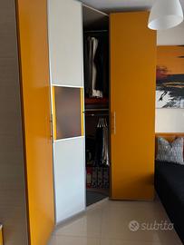 CAMERA PER RAGAZZI COMPONIBILE, COMPOSTA DA CABINA ARMADIO ANGOLARE 120x120 H260 ATTREZZATA CON RIPIANI ED APPENDERIE, CON 2 ANTE BICOLORE E STRUTTURA ROVERE CHIARO, PIÙ 2 MODULI DA 60xH260 CON ANTA TINTA UNITA. CASSETTIERA IN ROVERE CHIARO, LETTO SINGOLO COMPRESO DI MATERASSO, COMODINO CON CASSETTI BICOLORE E SEDIA CON RUOTE PER SCRIVANIA.