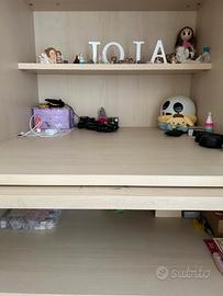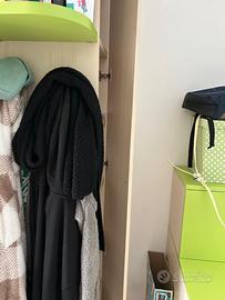 Camera Battistella in rovere sbiancato e accessori verdi. Due letti una piazza, uno sotto mobile con due cassettoni, quello sopra a ponte accessibile da scaletta a tre gradini contenitori. Scrivania estraibile. Armadio a quattro ante com cassettiera interna e angolo con scaffali chiuso. Due materassi inclusi e possibilità biancheria (coprimaterasso, piumino, lenzuola)