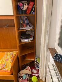 Camera per ragazzi ben conservata composta da armadio lungo a due ante con due grandi cassetti e tre ripiani di cui uno scorrevole, angoliera terminale a libreria e quattro ante corte