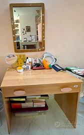 Camera per ragazzi. Legno e colore rosa e ocra. Letto, armadio 5 ante con 4 cassetti, zona libreria, scrivania con specchio, grande cassettiera con 7 cassetti. Smontaggio e trasporto a carico dell’ acquirente.