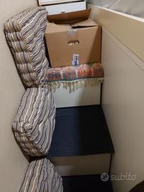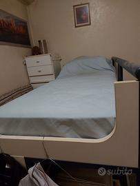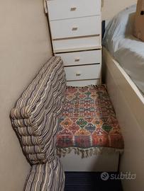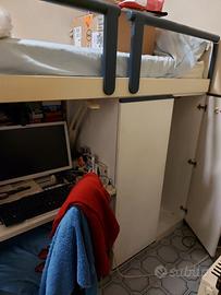 Camera per ragazzo composta da: libreria e scrivania, armadio con piani di appoggio ed appendiabiti, rete a doghe con materasso singolo, scalini con cassetti e cassettone ripostiglio.