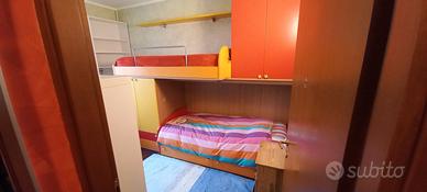 Tutto legno multistrato di falegnameria, fatta su misura, unico proprietatio, letto alto Ribaltabile con pistone olio praticissimo per cambio lenzuola. Armadio e cassettiere molto capienti per 2 bambini e 2 cambi di stagione. Scrivania studio, armadio libreria. Calza perfettamente in una stanza 3x4mt h 2,50mt.