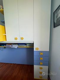 aggiungo cassettiera ampia blu con 4 cassetti e un cubolotto tre scomparti blu utilizzabile sia verticalmente sia orizzontalmente