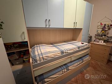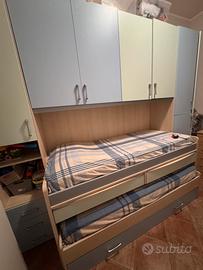Vendo camera a ponte come in foto conndue letto singoli estraibili, due ripiani/scrivania estraibile con due cassetti annessi, colori azzurro e verde