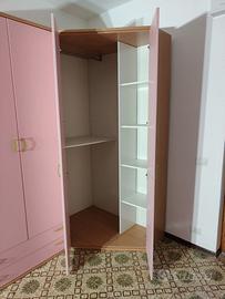 Vendo camera da letto banbina/ragazza ad angolo con letto, armadio ad angolo 4 porte, libreria doppia sedia e scrivania. Nuova mai usata solo montata, unico difetto il tavolo scrivania presenta due piccoli graffi.