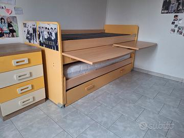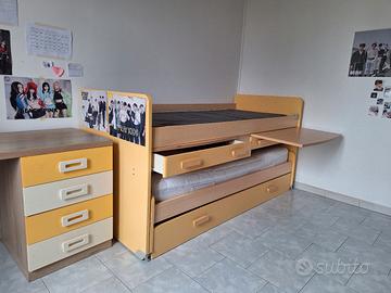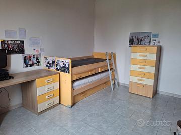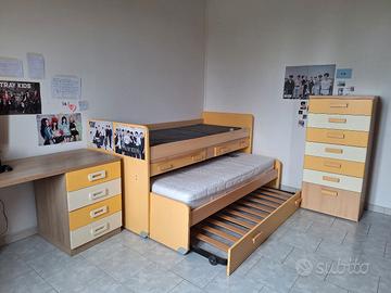 Camera da letto ragazzi 3 letti. scrivania, libreria, mobile 3 letti, settimino. Scrivania 75x58x120, Libreria 225x36x49, Mobile 3 letti 104x86x205, Settimino 132x47x60