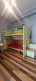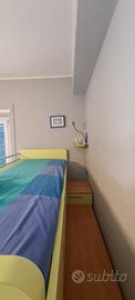 cameretta con letto a castello scorrevole. misure 90x200 letto chiuso 115x200 letto aperto. scala a cassettoni 90x45 che portano al letto di sopra con corridoio calpestabile e comodino.