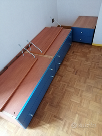 La boiserie (parete attrezzata) è composta da cassetti e binari in acciaio per lo scorrimento dei letti .