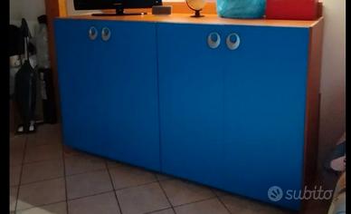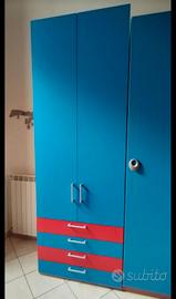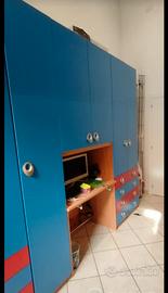 Arredamento per camera ragazzi, smontaggio e trasporto a carico di chi ritira, così composto: - Due letti: 1) con contenitore, rete e materasso non compresi 2) rete compresa, materasso non compreso. - Armadio a due ante con cassettiera. - Armadio a 5 ante con cassettiera, ponte con scrivania - Armadio a 4 ante basso. - Libreria L90xH230xP30 - Cassettiera per scrivania con ruote