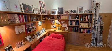 - Lato corto con 5 cassetti, 1 sportello, mensola superiore con 8 ripiani e faretto. Dimensioni: lunghezza cm 258 x altezza cm 170 x profondità cm 35.