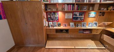 - Lato lungo cameretta con 11 cassetti e 1 sportello, 1 contenitore e mensola superiore con 3 ripiani e due faretti. Dimensioni: lunghezza cm 275 x profondità cm 35 x altezza cm 170.