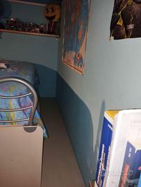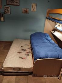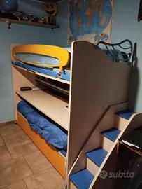 Vendesi cameretta per ragazzi a castello, tre posti letto disponibili. Completa di cassettiera. La cameretta presenta qualche graffio sui gradini ( vedere foto) ma per il resto e in ottimo stato. Il legno della cameretta e di ottima qualità. La cameretta e stata acquistata in mobilificio a conduzione familiare (Riva arredamenti) e non nei grossi store come ad esempio Mondo Convenienza o Ikea. Volendo si possono avere insieme anche i materassi usati ma in ottimo stato(2 unità) il terzo e nuovo, mai stato usato. La cameretta e stata pagata nuova 2500€. I gradini per salire al letto superiore sono contenitivi dove possono stare scarpe o altro.