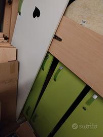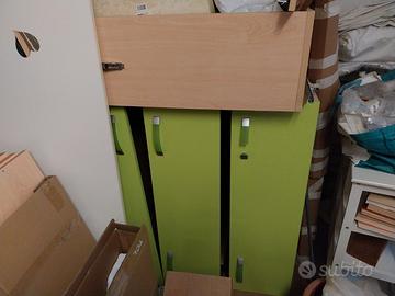Vendo, per trasloco, camera con armadio 4 ante e sei cassetti, 2 letti scorrevoli con doghe in legno con cassettoni sotto e mensole . Il tutto di colore legno chiaro con parti verdi come in foto. Legno di qualità, spesso e robusto.