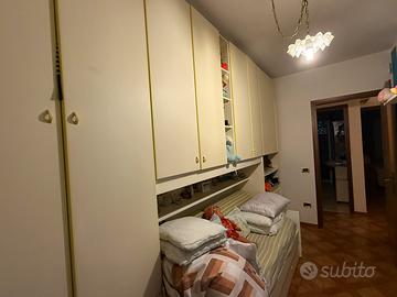 Cameretta a Ponte con 2 letti come da foto Secondo letto estraibile con rete (Lg. 194 P.85 H.50) ARMADIO (con cassettiera) + N.2 Mensole vome da foto SCRIVANIA 150x73x60 + cassettiera (larg. 60 Bianca con righe gialle coordinato letto uguale seduta scrivania come da foto *P.S. MATERASSI INCLUSI smontaggio a carico aquirente