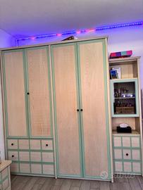 Vendo camera da ragazzo/a completa di armadio ,vetrinetta con tre cassetti , letto a una piazza e mezza , comodino e scrivania angolare apribile con tre cassetti in legno chiaro e profili verde acqua a soli € 500