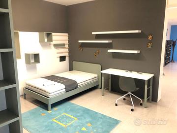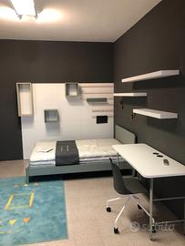 Camera da letto FEBAL CASA COLOMBINI collezione GOLF, composta da armadio da 270 cm di larghezza con libreria cm 296, con saliscendi e cassettiera interna, maniglia a gola verticale, pannellatura a parete completa di mensole e contenitori aperti, scrivania da 135 cm con ricarica wirless, mensole da 90, 120, 150 cm di larghezza letto per rete e materasso da 120 cm e sedia con ruote.