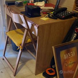 Arredamento camera singola con armadio a sei ante (larghezza 297, altezza 265, profondità 60) e doppio letto sotto, scrivania, sedia e libreria tre ripiani.