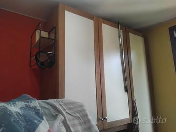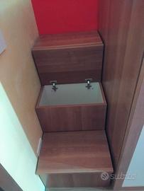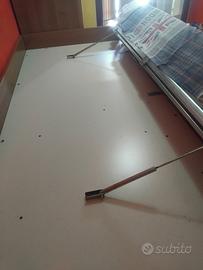 Camera da Letto completa : letto singolo su ponte con movimento ribaltabile , scaletta con 3 gradoni contenitori , 3 moduli armadio( 1 sotto il letto , uno sul ponte , 1 verticale con anche 4 cassetti ) ..1 Scrivania ruotabile con cassettiera con rotelle .