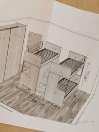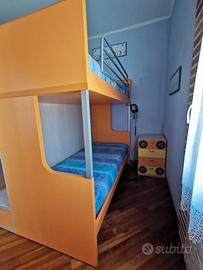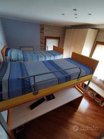 Una camera da letto soppalcata con 3 letti da adulto lunghi 200 cm, completa di scrivania lunga 2 metri, libreria, comodino e scala con 4 contenitori ampi. Usata solo 3 anni , come nuova, legno massiccio, completa di doghe in legno, comprata in mobilificio. Si vende smontata fornita di tutto. Misure nel disegno. Non spedisco . Valore di acquisto oltre 3 mila euro, vendo a 500 euro.