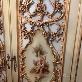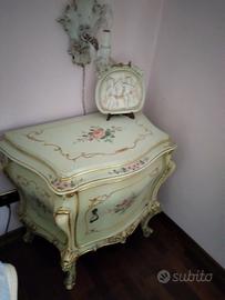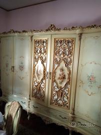 Camera stile veneziano, tutta in legno intarsiato. Camera del 1968, come nuova, conservata in perfetto stato.Letto matrimoniale, armadio, comò, due comodini, due abat jour,poltrona e lampadario.