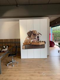 La camera e' composta da Armadio l. 178 cm., p. 60 cm., alto 261 cm. con Serigrafia (immagine sulle ante) e cassettiera interna, segue Boiserie (Pannellatura) l. 330 cm. ancorata a parete dove scorrono tramite guide i 2 letti e la Scrivania, i letti e la scrivania sono trafilati in alluminio laccato. Il Letto superiore e' l. 226 cm. e profondo 100 cm., il Letto inferiore e' l. 200 cm. e profondo 100 cm., la Scrivania e' l. 213 cm. p. 65 cm.,. In alto 1 Cubo a giorno l. 100 cm. e 2 Cubi l. 50 cm.(tutti laccati in Rosso Ribes). Le Finiture sono: Noce e Bianco (laminati) e Canna da fucile su trafila in alluminio (laccato).