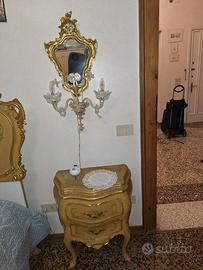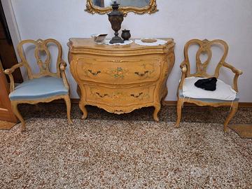 Vendesi camera veneziana originale intarsiata, decorata e dorata a mano da artigiani veneziani completa di letto matrimoniale, n.2 comodini, n.1 comò e n.2 sedie. Su richiesta disponibile anche n.1 armadio a sei ante in stile. Disponibili ad effettuare il trasporto su barca a Venezia Centro Storico fino ingresso piano terra o fino al Tronchetto per caricazione su camion con addebito di ulteriori 300,00 €.