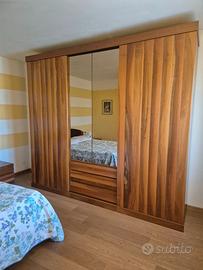Camera da letto matrimoniale in legno di noce scuro con venature più chiare. La camera comprende due comodini con due cassetti, il letto matrimoniale, un comò (con sei cassetti) e un armadio diviso in tre sezioni. La prima e l'ultima sezione hanno due scomparti per apprendere i vestiti, mentre quello centrale comprende uno specchio a due andate e al di sotto 3 cassetti.