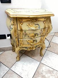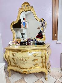 Laccata e Dipinta a mano. Costruita a mano. Foglie in oro. Composizione: 1 armadio, con ante, e cassetti interni, 1 comodini, 1 comò, 1 specchiera, 1 letto ad una piazza e mezza con testata e pediera. Prezzo non trattabile.