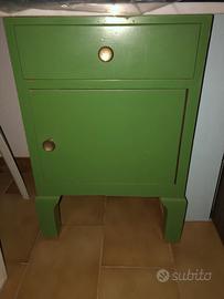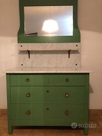 Camera vintage composta da armadio 2 ante con specchio misure L119xH191,5xP57. cassettiera con piano e mensolina e sottospecchio in marmo misure L99/105xH80/188xP52. comodini con piano in marmo L42xH63xP36. Letti completi di reti a molla su struttura in legno, testate, pediere e fasce laterali L93/101xH118x190.