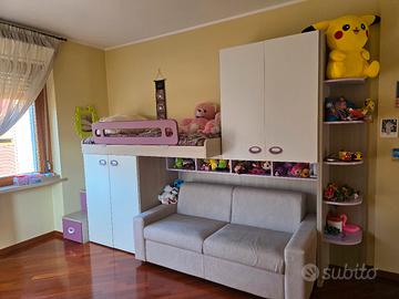 cameretta bambina completa, compresa di scrivania e divano letto color panna con rifiniture color lilla lunghezza 3 metri e mezzo circa, volendo delle parti possono essere scomposte come la scaletta e l'angoliera