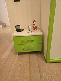 Vendo cameretta composta da: armadio con due ante scorrevoli, dotato di una cassettiera interna (190 cm di larghezza 0,66 di profondità), comodino con due cassetti, letto singolo rivestito in ecopelle, scrivania bianca con tre cassetti perfetta per studio o lavoro e una grande mensola ideale per riporre oggetti e libri.